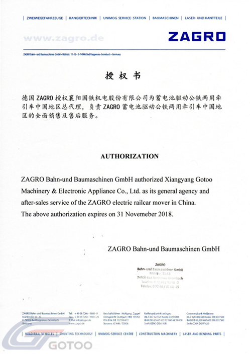 In November 2016, Gotoo and the world's most famous railcar mover manufacturer Zagro signed a cooperation agreement, becoming the China distributor of ZAGRO E-MAXI battery-driven railcar mover in China, and the only cooperative manufacturing base in Oversea.
