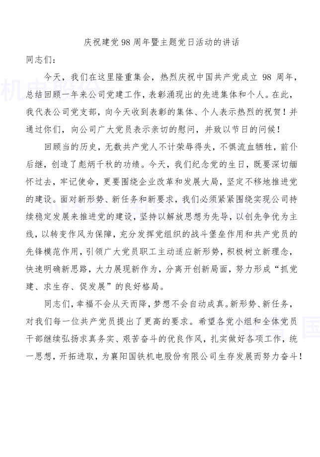 今年是建黨98周年?!捌咭弧鼻昂?,襄陽國鐵機電股份有限公司開展了豐富多彩的紀念活動,以傳承紅色基因、弘揚革命精神,不忘初心、牢記使命,矢志為中華民族偉大復(fù)興中國夢努力奮斗。